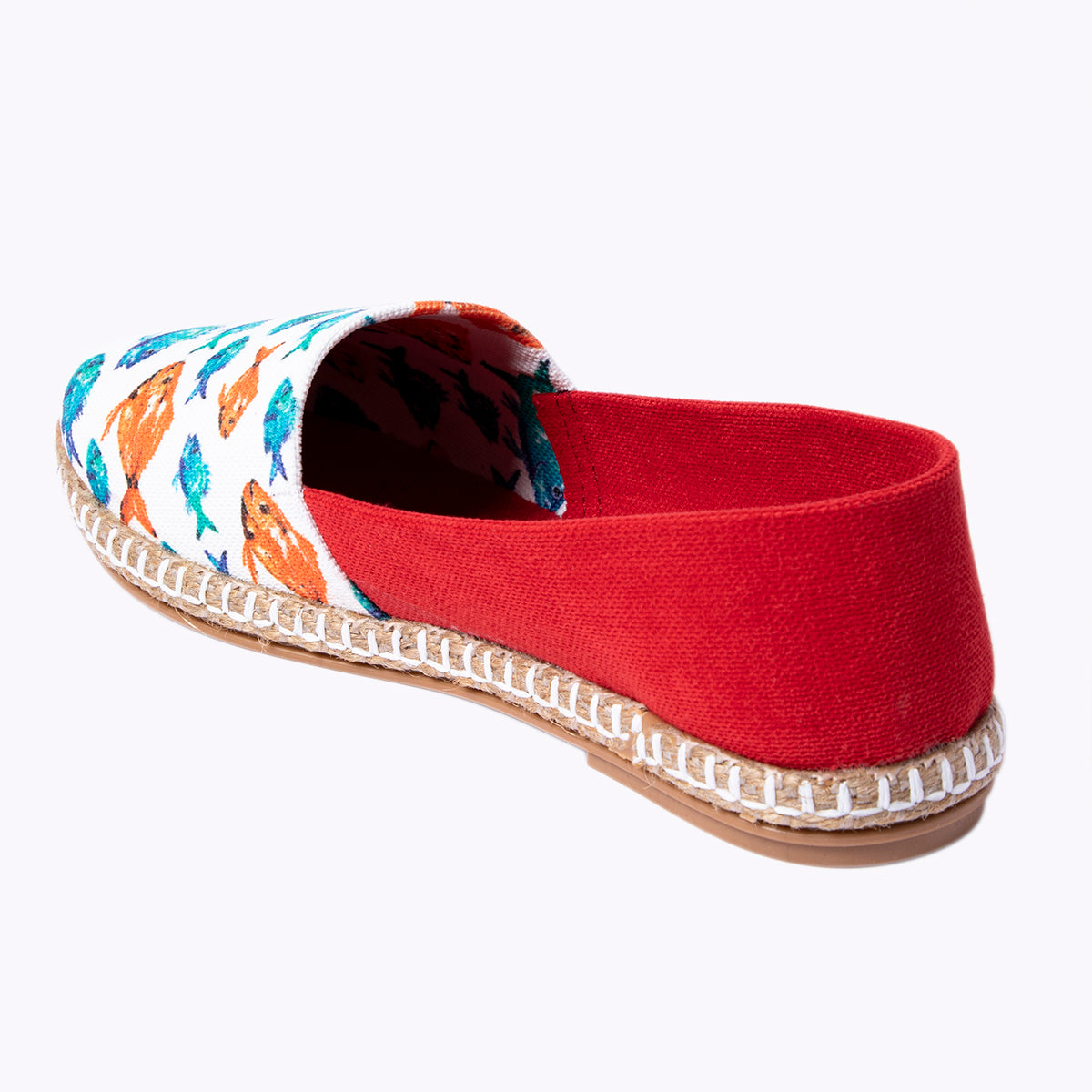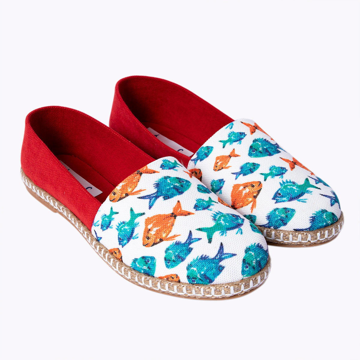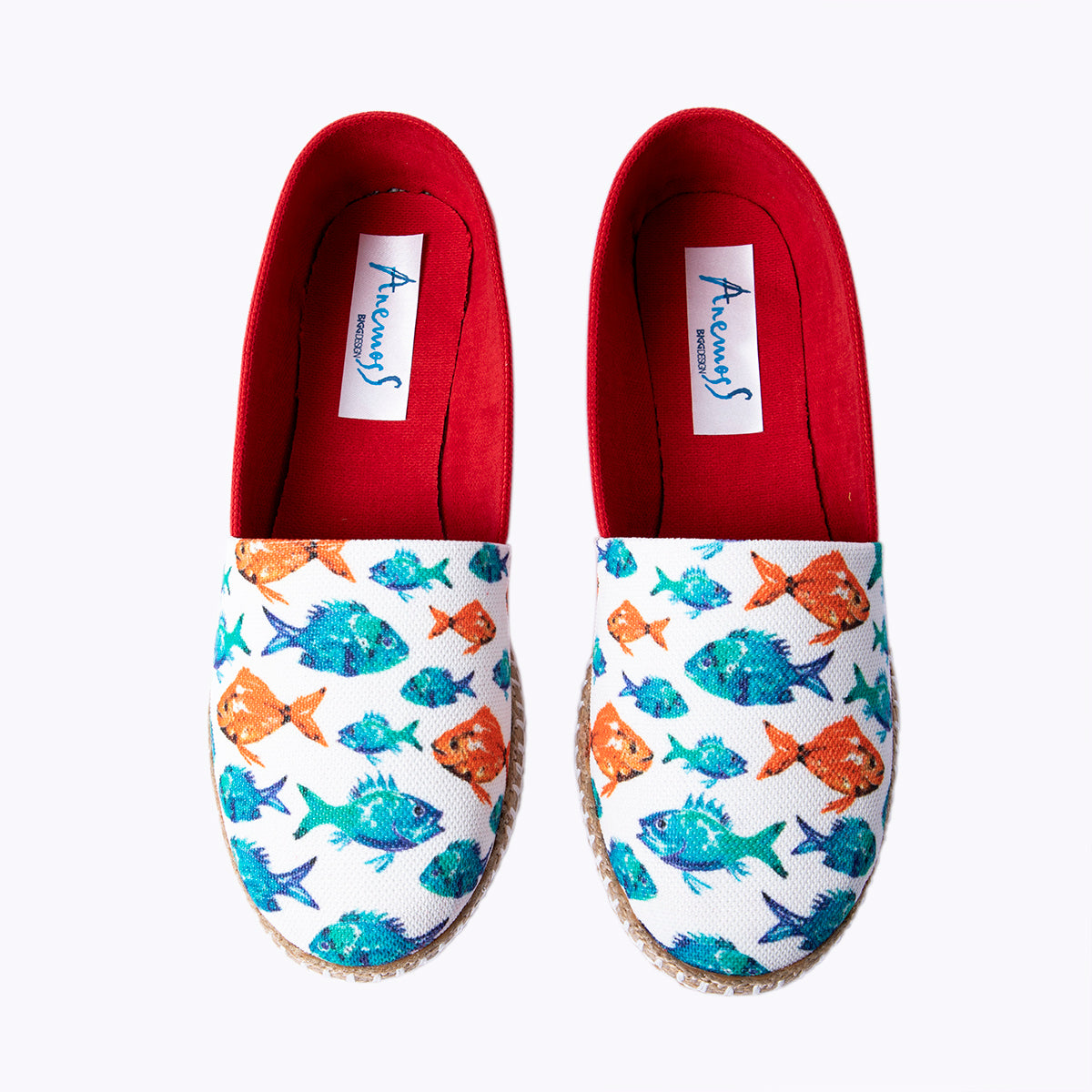 Sanatçı Gamze Yalçın'ın Akvaryum deseninin uygulandığı kadın ayakkabı. Üst kısmı tamamen %100 keten kumaştan yapılmıştır. Ayakkabının altı hasır ve termo tabandır. Hava alan yapısıyla yazın vazgeçilmez parçalarından olan Anemoss ayakkabılar ile çok rahat edeceksiniz. Ana rengi beyaz olan ve renkli balık desenlerinin olduğu tasarım ile çok şık olacaksınız. Ege esintilerinden ilham alınarak oluşturulan koleksiyon tüm deniz tutkunları için tasarlanmıştır.