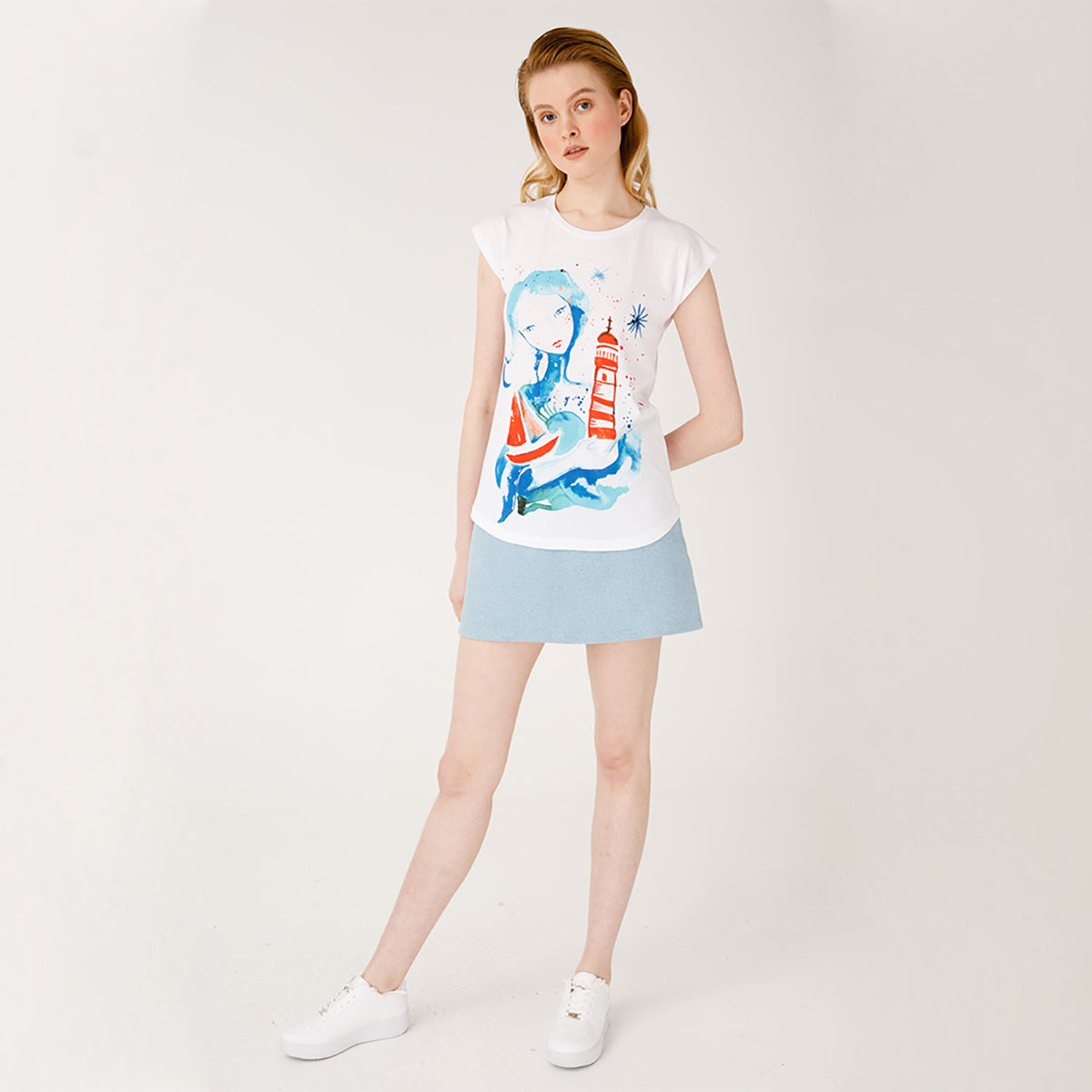 ÖZEL TASARIM T-SHIRT: Anemoss Koleksiyonu sanatçı Gamze Yalçın’ın Ege Bölgesi’nin eşi benzeri olmayan esintilerinden ilham alarak yarattığı ismiyle özdeş bir yaz koleksiyonudur. Marin temasının en güzel örneklerinden olan fener deseni beyaz, kırmızı ve mavi tonların bütünlüğü içerisinde yaz stiline uyumlu bir görünüme sahiptir. Özel deseni emprime tekniğiyle uygulanmıştır, t-shirt ile tamamen birleşik olduğu için dokunulduğunda plastik baskı hissi vermez, yumuşacık dokusu vardır