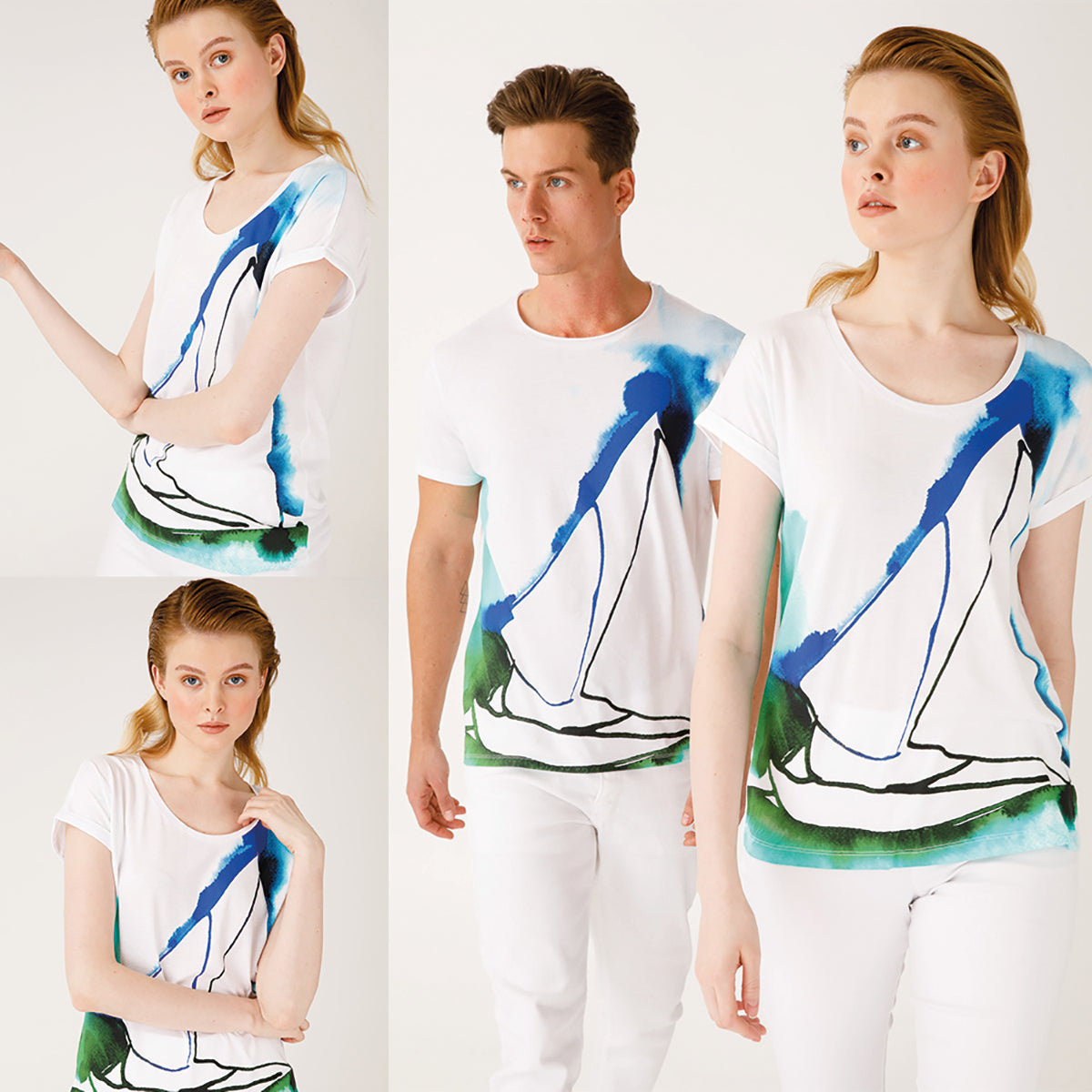 ÖZEL TASARIM T-SHIRT: Anemoss Koleksiyonu sanatçı Gamze Yalçın’ın Ege Bölgesi’nin eşi benzeri olmayan esintilerinden ilham alarak yarattığı ismiyle özdeş bir yaz koleksiyonudur. Marin temasının en güzel örneklerinden olan yelken deseni beyaz, yeşil ve mavi renkleri ile bir bütünlük içerisinde olarak yaz stiline uyumlu bir görünüme sahiptir. Özel deseni emprime tekniğiyle uygulanmıştır, t-shirt ile tamamen birleşik olduğu için dokunulduğunda plastik baskı hissi vermez, yumuşacık dokusu vardır