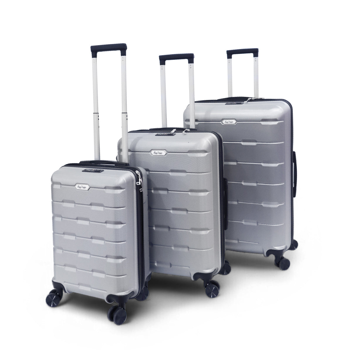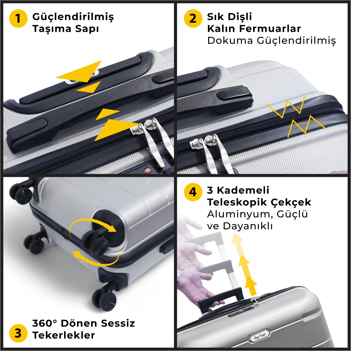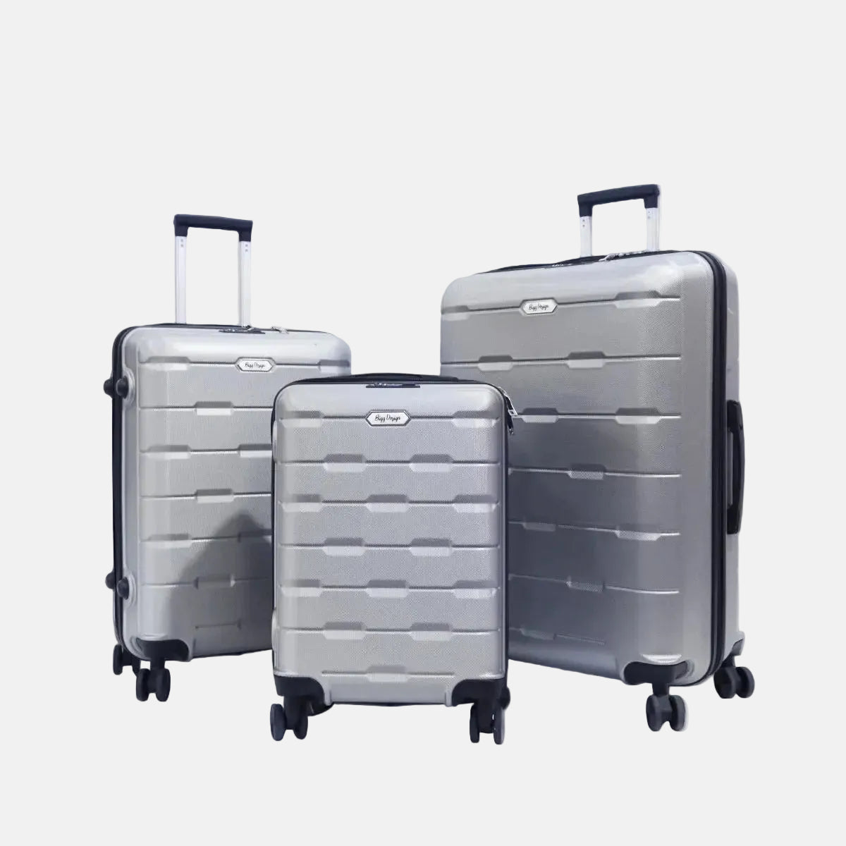 Biggdesign Moods Up gümüş renkli 3’lü valiz seti; kabin boy (20"), orta boy (24") ve büyük boy (28") olmak üzere üç parçadan oluşur ve boşken iç içe geçebilir. Bu valizlerin gövdesi, %100 ABS sert plastik malzemeden üretilmiş olup, hem darbelere karşı dayanıklıdır, hem de hafiftir.