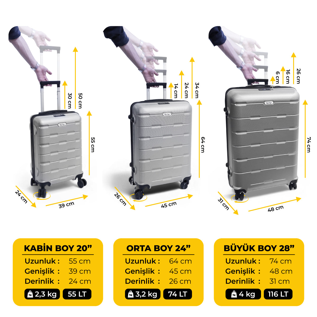 Büyük Boy (28"): 74 x 48 x 31 cm | Ağırlık: 4 kg | Hacim: 116 Litre