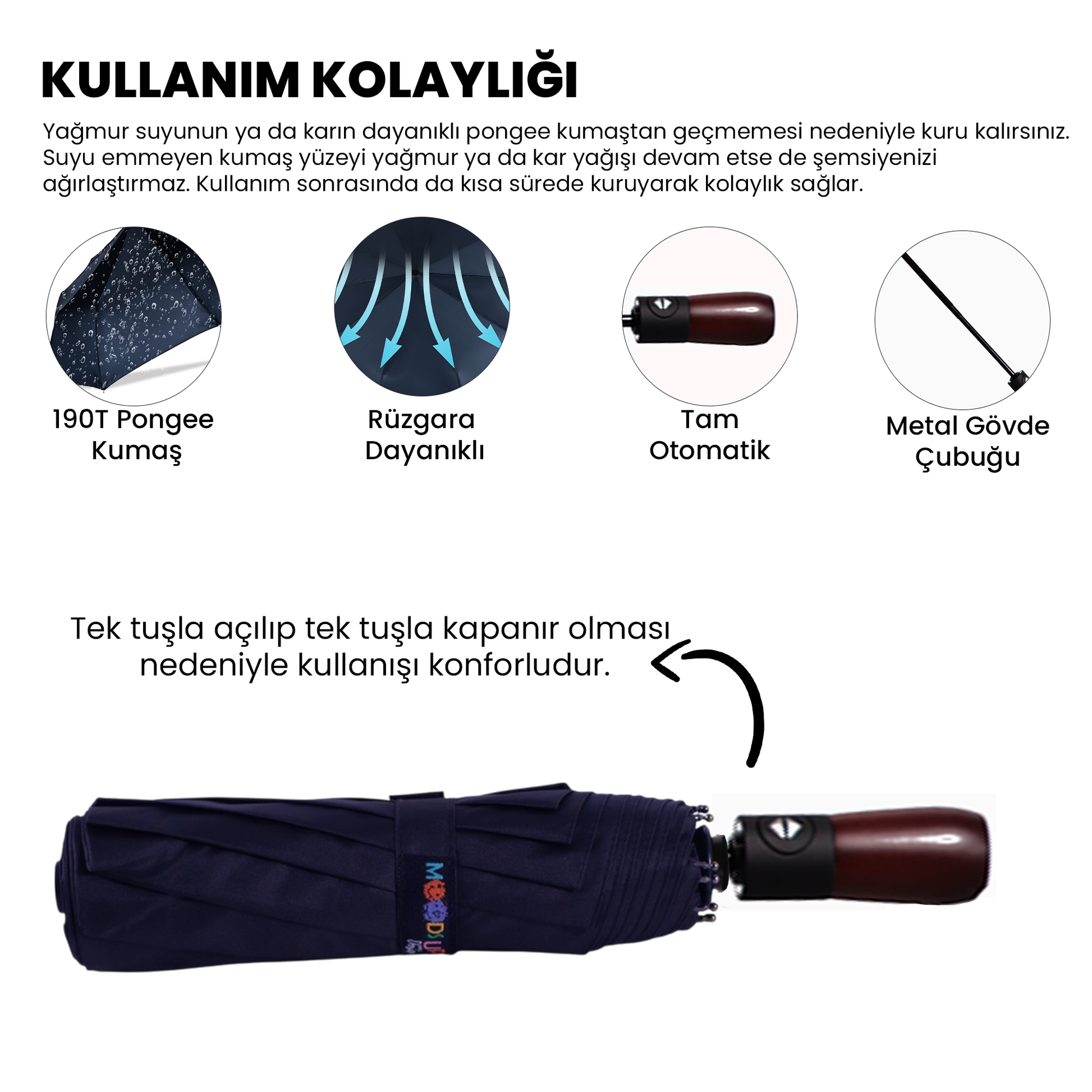 Siyah renkteki metal malzemeden yapılmış olan gövde çubuğu, rüzgara karşı oldukça dayanıklı çift fiberglas ve metal çerçeve telleriyle güçlendirilerek üretilmiştir. 190T Pongee kumaşı, suya dayanıklı ve hızlı bir şekilde kuruyan yapısıyla günlük kullanımı kolaylaştırır. Ahşap ve plastik sap tasarımının bir arada kullanılmasıyla birlikte elastik bant halkasıyla konforlu bir taşıma imkanı sunar.