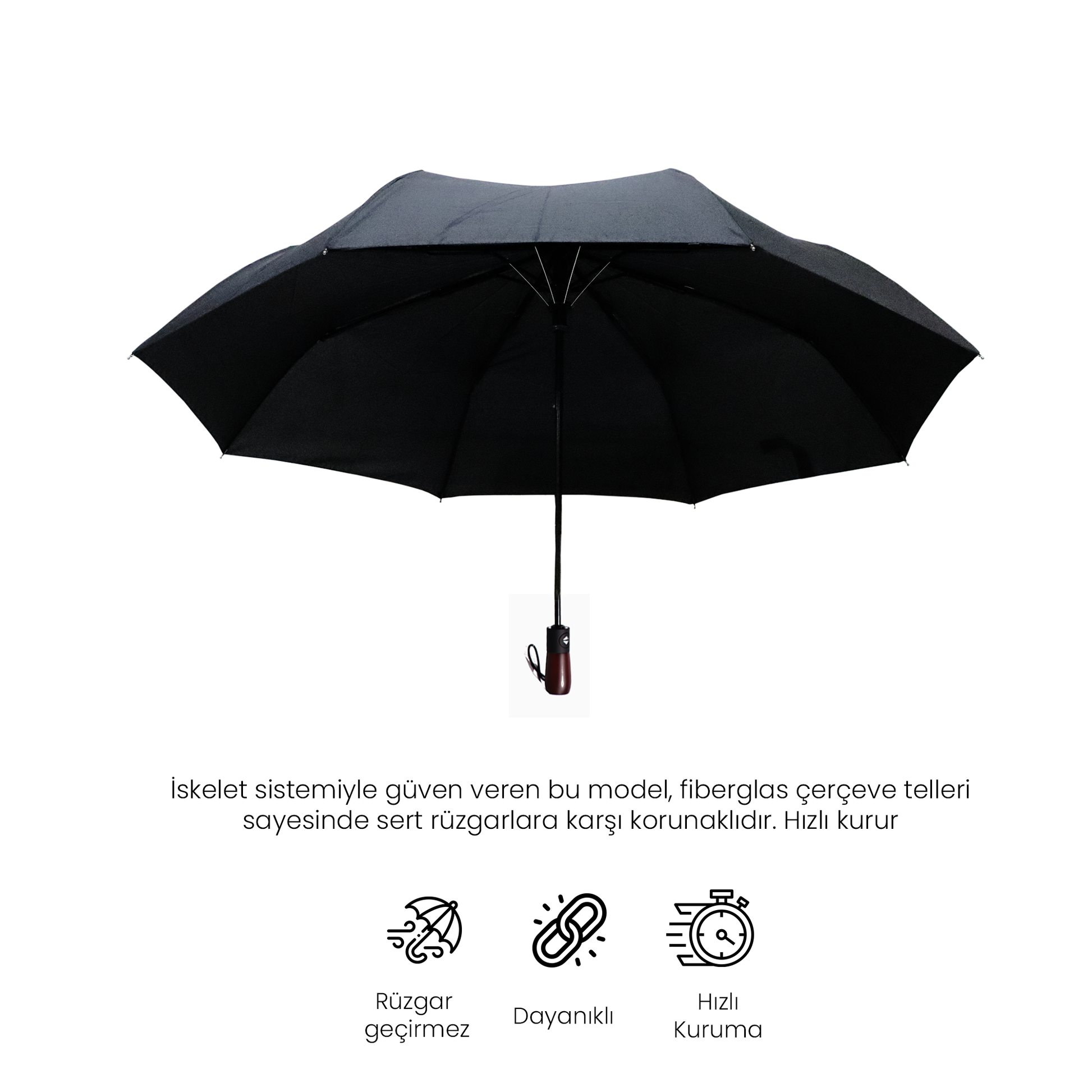 Siyah renkteki metal malzemeden yapılmış olan gövde çubuğu, rüzgara karşı oldukça dayanıklı çift fiberglas ve metal çerçeve telleriyle güçlendirilerek üretilmiştir. 190T Pongee kumaşı, suya dayanıklı ve hızlı bir şekilde kuruyan yapısıyla günlük kullanımı kolaylaştırır. Ahşap ve plastik sap tasarımının bir arada kullanılmasıyla birlikte elastik bant halkasıyla konforlu bir taşıma imkanı sunar.