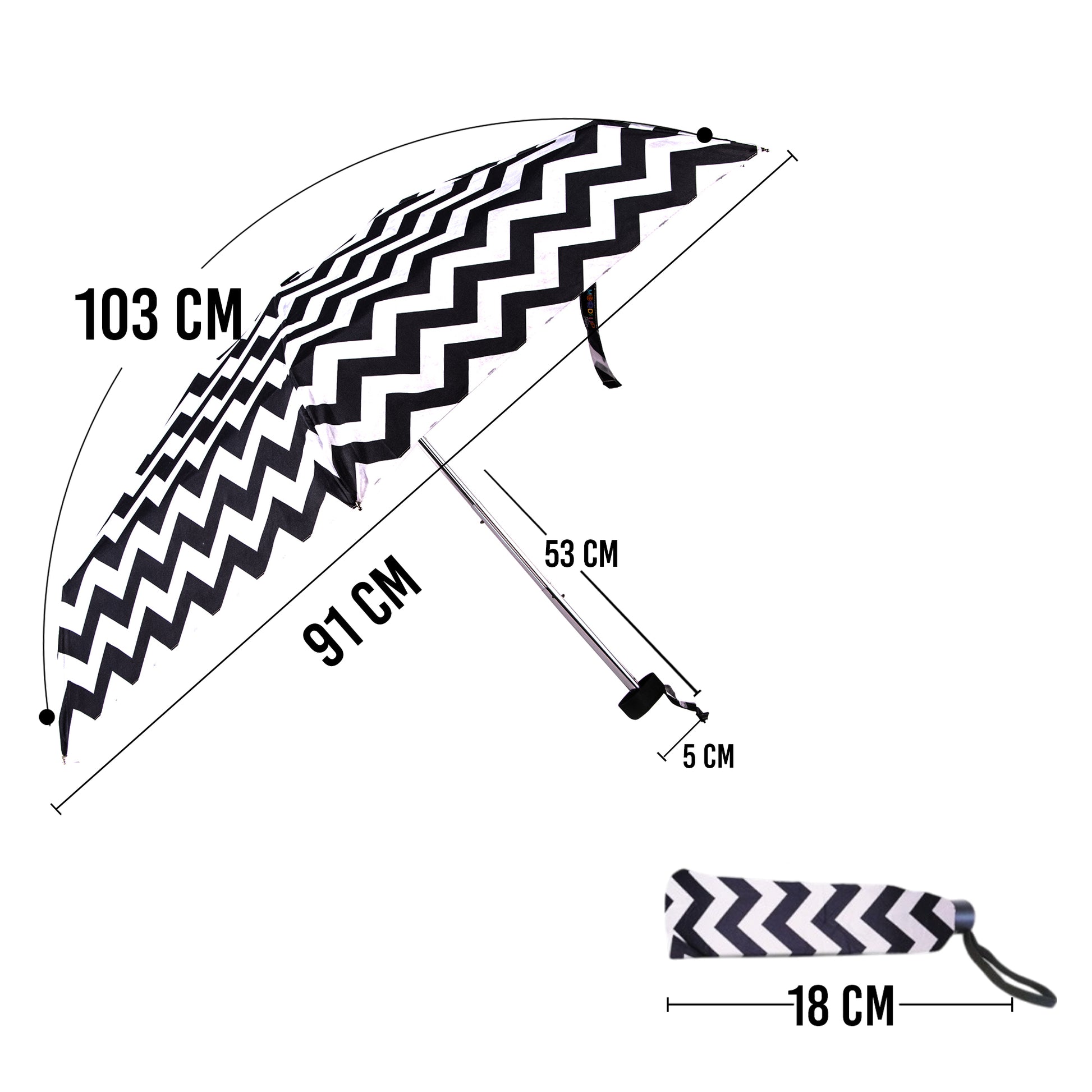 Biggdesign Moods Up Siyah Beyaz Zikzaklı Mini Şemsiye, fonksiyonel tasarımı ve renkli desenleri bir arada kullanan kompakt bir üründür. 19" ( 48 cm ) x 6 panel boyutundaki bu şemsiye, kolay taşınabilir olma özelliği sayesinde çantanızda rahatlıkla taşınabilir ve her an her yerde kullanımınıza hazırdır.
