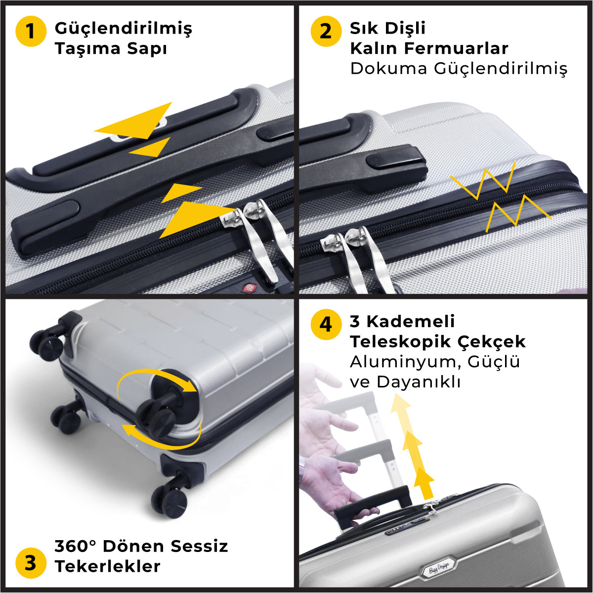 %100 Türk malı olan bu valiz sessiz tekerlekli valiz, TSA kilitli sert kabuk valiz, hafif valiz, 20” küçük boy valiz, gümüş rengi valiz gibi aramalar yapan kullanıcılar için ideal bir tercihtir.
