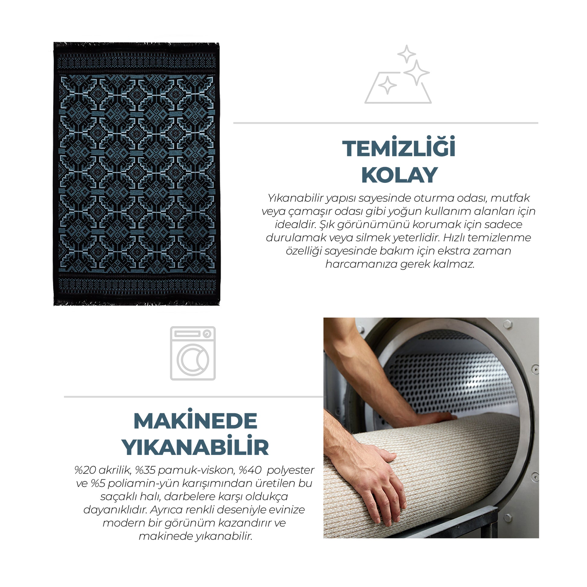 Ürün İçeriği: %20 akrilik, %35 pamuk-viskon, %40 polyester ve %5 poliamin-yün karışımıyla üretilmiş bu saçaklı kilim, darbelere karşı oldukça dayanıklıdır. Bununla birlikte renkli deseni ile evinize geleneksel bir bakış getirir.
