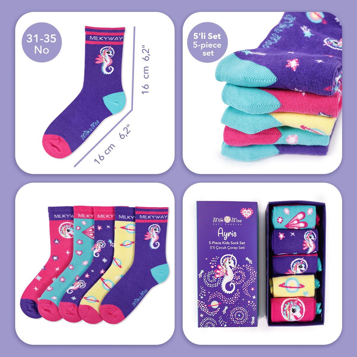 Milk&Moo Ayris Çocuk 5'li Çorap Seti, Beden 31-35, Renkli ve Rahat Tasarım