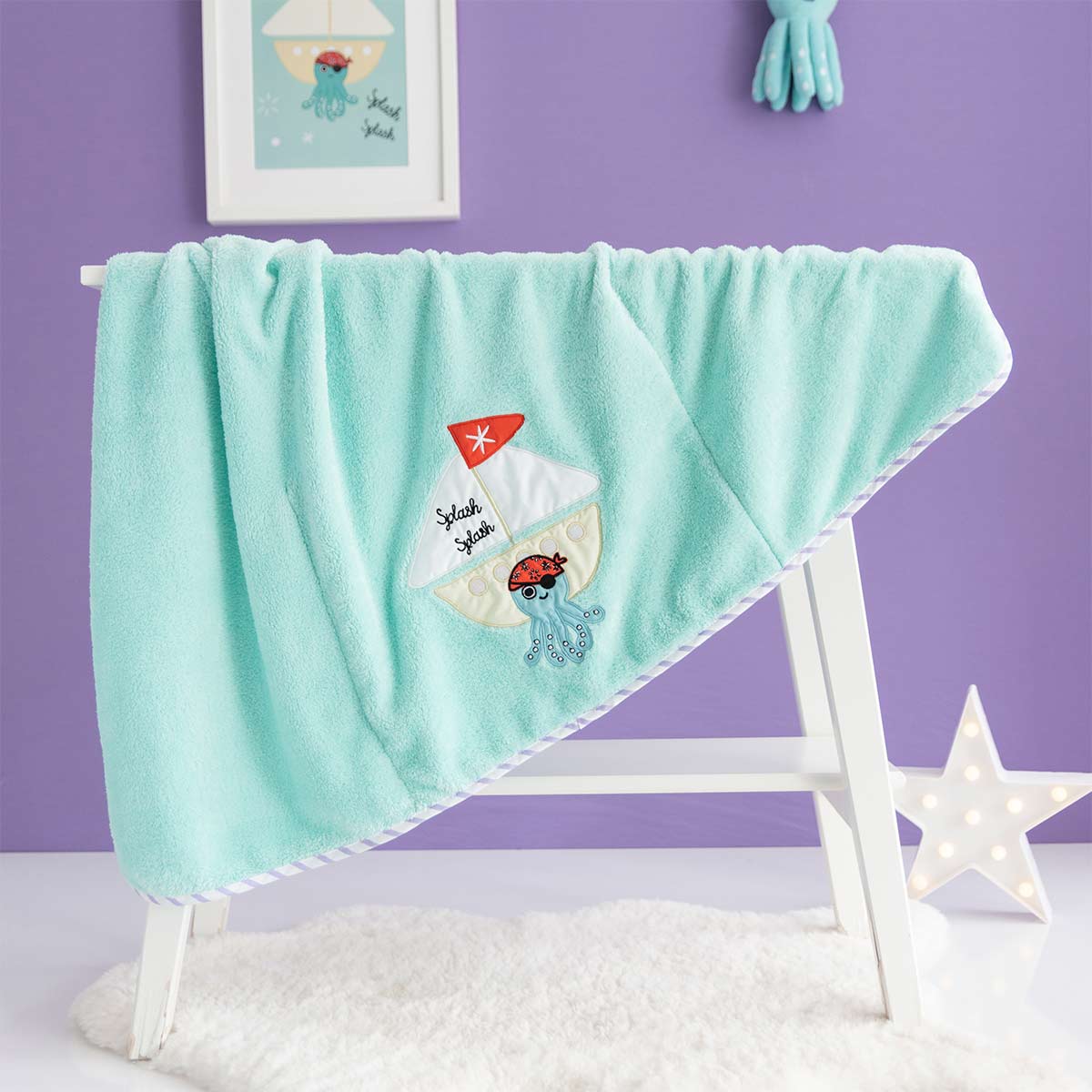 Yumuşacık dokulu ve hafif, Denizci Ahtapot aplike ve nakış detaylı battaniye, bebeğinizi sıcacık tutacak ve rahat bir uyku uyumasını sağlayacaktır. Vazgeçilmez turkuaz tonunu kullandığımız battaniyemizde yine mor beyaz çizgili kenar biyeleri ile özgün bir tasarım sunuyoruz.