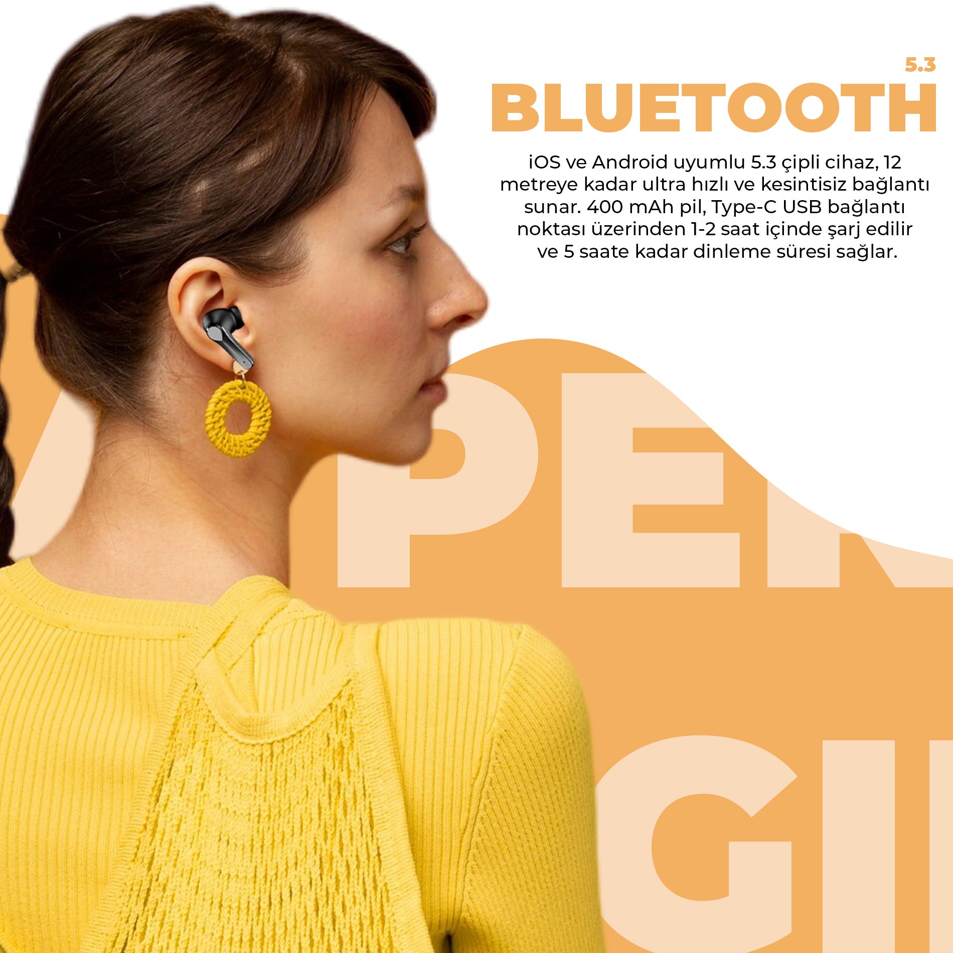 KUSURSUZ KABLOSUZ BAĞLANTI: 5.3 çiple donatılmış iOS ve Android uyumlu kulaklıklar, 12 metreye kadar ultra hızlı ve kopmayan bir bağlantı sunar. 400 mAh pil, Type-C USB girişi ile 1-2 saat içinde şarj olarak 5 saate kadar dinleme süresi sağlar.