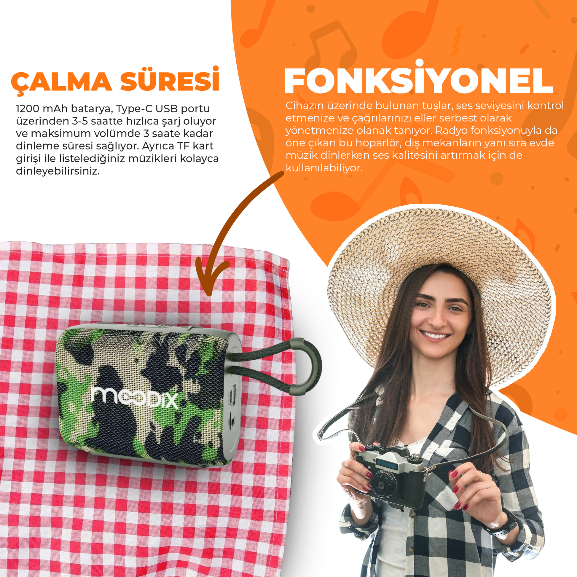 - 5W çıkış gücüne ve 90 dB hassasiyete sahip Moodix Bluetooth hoparlörü, 9,3x5x15 cm boyutlarıyla çantanızda kolayca taşıyabilirsiniz.