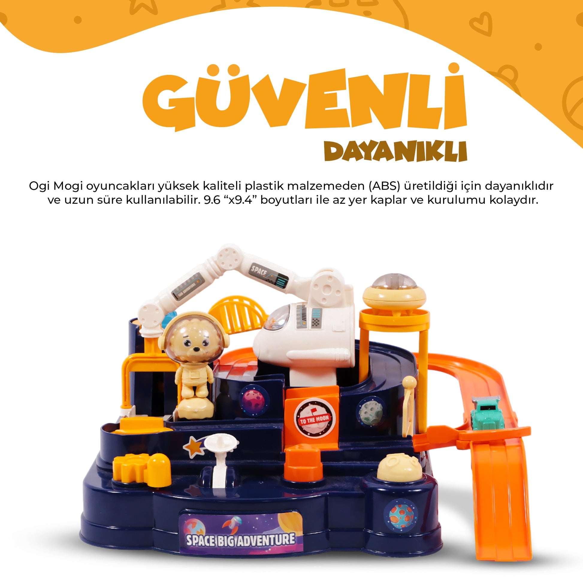 UZAY MACERASI OYUN SETİ: Ogi Mogi Toys Uzay Macerası Oyun Seti; 1 astronot, 1 uçan daire, 2 araba ve kaydıraklı yarış pistlerinden oluşur. 4 yönlendirme düğmesi ve 7 kontrol noktasıyla oyun çok daha eğlenceli hale gelir. Tüm parçalar çocukların sağlığı düşünülerek güvenilir malzemelerden üretilmiştir.